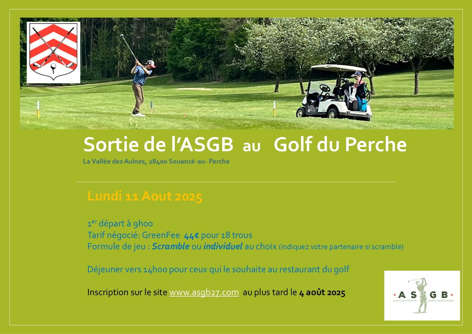 Sortie de groupe le 11 aout 2025 sur le Golf du perche organisée par l'ASGB date limite d'inscription le 4 aout 2025