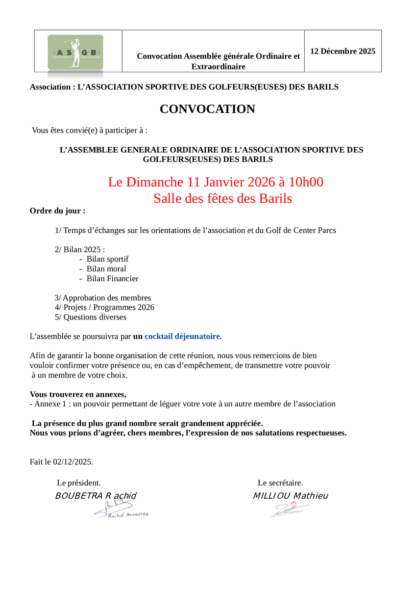 Assemblée Générale ASGB dimanche 11 janvier 2026 10h00 salle des fêtes des Barils